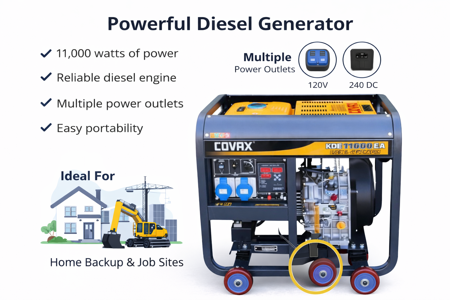 Unmatched Power and Engineering Excellence When the grid fails or the job site calls for serious energy, the COVAX K-CO-KDE-11000EA stands ready. At the heart of this machine is a powerful V-type, twin-cylinder diesel engine. This four-stroke powerhouse is designed to maintain high torque even under heavy loads, ensuring that your tools, appliances, or industrial machinery stay running without a hitch. Whether you are operating at 50Hz or 60Hz, this generator provides the stable performance necessary for modern power needs.