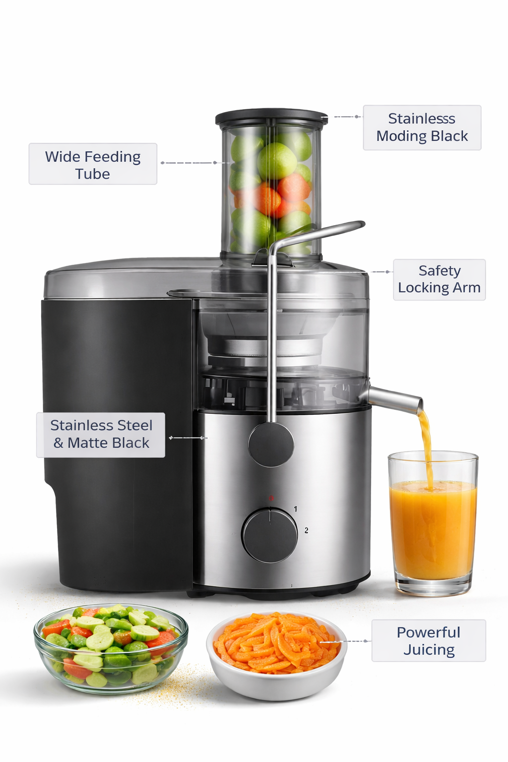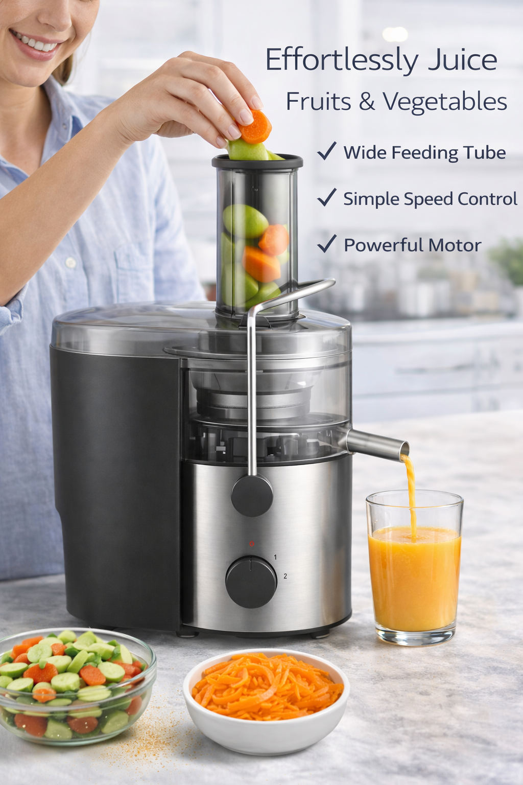 Forget the tedious prep work. Thanks to the 75mm extra-wide feeding tube, you can toss in whole apples, pears, and carrots without the need for pre-cutting. With a massive 2-liter pulp container and a 1.5-liter juice jug, you can process up to 10 apples in a single session, making it the perfect companion for busy households and meal-preppers alike.