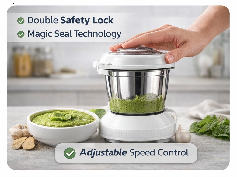 Safety and convenience go hand in hand. The double safety lock system ensures the jars are properly secured before operation, while the built-in circuit breaker protection shields the motor from overload, extending the life of the appliance. Thanks to magic seal protection, you can enjoy mess-free operation without worrying about leaks or spills.